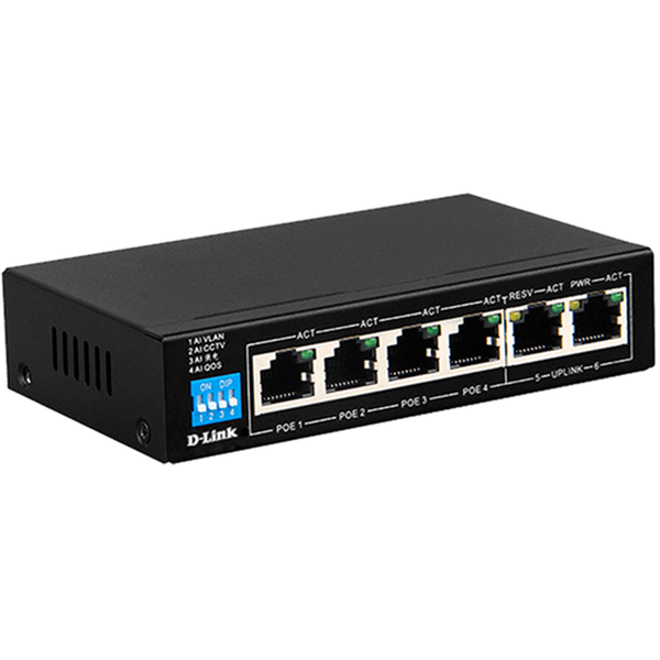 DES-F1006P-E - 4 x 10/100 Mbps Fast Ethernet PoE+ Ports - 2 x 10/100 Mbps Uplink Ports- PoE+ support - up to 30W per port- Long Reach PoE support - up to 250m- Smart Features: Extend, VLAN, QoS and PoE Reset- Lightning protection built-in (6kV)- PoE Budget 60 Watts- Plug &; Play Installation Built for your Needs Robust and cost-effective PoE solution to provide power for your PoE powered devices such as IP cameras, CCTV, VoIP, Wi-Fi Access Points, etc. Up to 250m PoE and Data Transmission Equipped with PoE extend technology, the DES-F1006P-E have the capability to supply 802.3af/at PoE and data connectivity on cables up to 250m long. 6KV Surge Protection D-Link DES-F1006P-E switch is enhanced with 6KV surge protection. This effectively protects the switch against sudden electrical surges caused by events such as lightning strikes or unstable electrical current. Built-in 6 kV surge protection significantly reduces the chances of equipment being damaged from electrical surges, and effectively lowers maintenance costs by minimizing the need for expensive equipment repairs or replacement. Enhanced with VLAN Function With a flick of button you can isolate switch ports from each other, but still allowing the devices to communicate via the uplink ports. This feature not only adds security but can also effectively suppress network storms and improve network performance. Enhanced with QoS The DES-1006P-E switch performance is enhanced with QoS (Quality of Service) feature to ensure that critical network services such as IP surveillance, VoIP, IPTV are always given high priority. This feature makes the switch a perfect solution for IP Camera/CCTV applications. Intelligent Detection With AI PoE feature enabled the switch can automatically detect an unresponsive PoE device and reboot the devices in order to recover it.