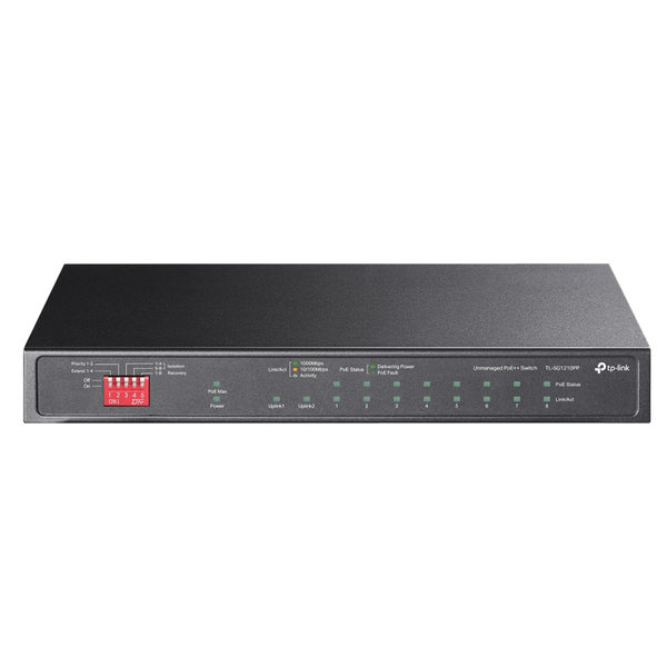 10-Port Gigabit Desktop Switch with 6-Port PoE+ and 2-Port PoE++ - 9× 10/100/1000Mbps RJ45 Ports, 1× 1000Mbps Combo SFP/RJ45 Port - With 2× PoE++ ports and 6× PoE+ ports, transfers data and power on one single cable - Works with IEEE 802.3af/at/bt compliant PDs - 802.1p/DSCP QoS enable smooth latency-sensitive traffic - Supports PoE Power up to 30 W for each PoE+ port and 60 W for PoE++ port - Supports PoE Power up to 123 W for all PoE ports* - Plug and Play, no configuration and installation required - Up to 250m data and power transmitting range under Extend Mode** - PoE Auto Recovery guarantees stable operation of PoE devices by automatically rebooting the dropped or unresponsive PD devices - Isolation Mode allows one-click client traffic separation for higher security and performance - Priority Mode guarantees the quality of sensitive applications like video monitoring in critical business areas by prioritizing the data of ports 1-2
