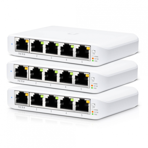5-Port managed Gigabit Ethernet switch powered by 802.3af/at PoE or 5V, 1A USB-C power adapter - 3 Pack Build and expand your network with the UniFi® Switch, part of the Ubiquiti UniFi Enterprise System. The UniFi Switch, model USW-Flex-Mini, is a smart managed Gigabit switch. It offers 5 RJ45 Ethernet ports, providing 1 Gigabit links to your devices. Power up the USW-Flex-Mini with the included USB Type-C power adapter or with 802.3af PoE Ethernet in port 1. Managed by UniFi Network Controller version: 5.12.5 or higher *5V, 1A USB-C power adapter included only with the single-pack of the USW-Flex-Mini. Compact Desktop Design The cost-effective UniFi Switch Flex Mini can be discreetly integrated into any environment. Copper Connectivity Five RJ45 ports offer 10/100/1000 links. One port also supports 802.3af/at PoE input. Efficient Use of Energy The UniFi Switch Flex Mini uses only a maximum of 2.5W. For your convenience, it can be powered by 802.3af/at PoE or a 5V, 1A USB-C power adapter*. * Included only with the single-pack of the USW-Flex-Mini. Switching Performance The UniFi Switch Flex Mini offers the forwarding capacity to simultaneously process traffic on all ports at line rate without any packet loss. Deployment Example The UniFi Switch Flex Mini connects a variety of devices, including a printer, game console, NAS, and computer.