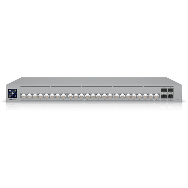 Pro HD 24 Professional-grade, Layer 3 Etherlighting™ switch with (2) 10 GbE, (22) 2.5 GbE, and (4) 10G SFP+ ports. - Etherlighting™ ports that illuminate to indicate port location, speed/link, and native VLAN/network*- (22) 2.5 GbE, (2) 10 GbE ports- (4) 10G SFP+ ports- DC power backup ready** *Pair with UniFi Etherlighting Patch Cables for optimal brightness.**Requires UniFi RPS.