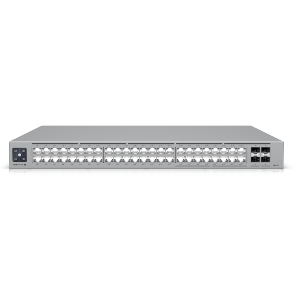 A 48-port, Layer 3 Etherlighting™ switch with 2.5 GbE and PoE++ output. Etherlighting™ ports that illuminate to indicate port location, speed/link, and native VLAN/network* - (16) 2.5 GbE ports including (8) PoE+ and (8) PoE++ - (32) GbE ports including (24) PoE+ and (8) PoE++ - (4) 10G SFP+ ports - DC power backup ready - 720W total PoE availability - Managed with UniFi Network 8.0.24 and later