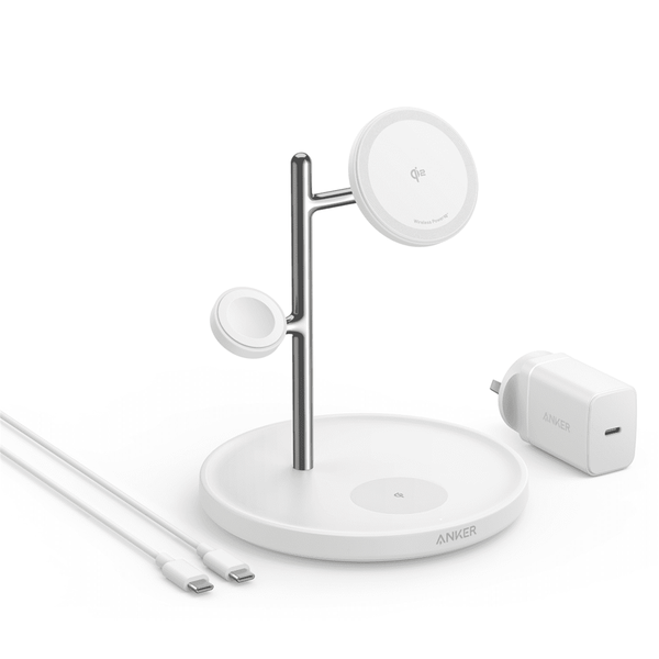 Anker MagGo 3-in-1 Wireless Charging Stand with Qi2 Anker 3-in-1 Wireless Charging Station, Qi2 Certified 15W MagSafe-Compatible Wireless Charging Stand, For iPhone 15/14/13 Series, AirPods Pro, Apple Watch Ultra (USB-C Charger and Cable Included) 15W Ultra-Fast Charging Immerse in a superior charging experience with 15W power, guaranteed by Qi2 certification and MagSafe compatibility for a fast, safe, and efficient charge every time. Aesthetic Multi-Device Charging Elegant design and precise spacing with an innovative "tree-like" structure, allowing seamless simultaneous charging of your iPhone, Apple Watch, and AirPods Safety First Rely on Anker's proprietary ActiveShield technology which monitors temperatures over 3,000,000 times per day to ensure the safest charging