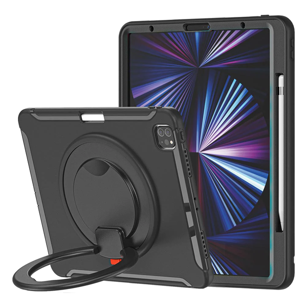RON-iPad-PR9 | iPad Pro 12.9 ( 5th / 6th Gen ) 2021 / 2022 | Rugged kids case with kick-stand &; pencil Holder &; folding grip - Ultra 3 layers impact resistant design- Rigid engineering material frames protect against drops- Premium TPU shock absorption cladding provides extreme protections- Kids friendly large hard grip design for easy carry- Kickstand feature for typing, playing games and watching movies- 360 degree swivels hand straps design for one-handed operation- Super sturdy and absolutely Kids Friendly Design- Front raised edges recess your screen to protect it when placed face down- Form fitting design crafted with high precision- Precise cutouts and tactile buttons ensure quick access and feedback