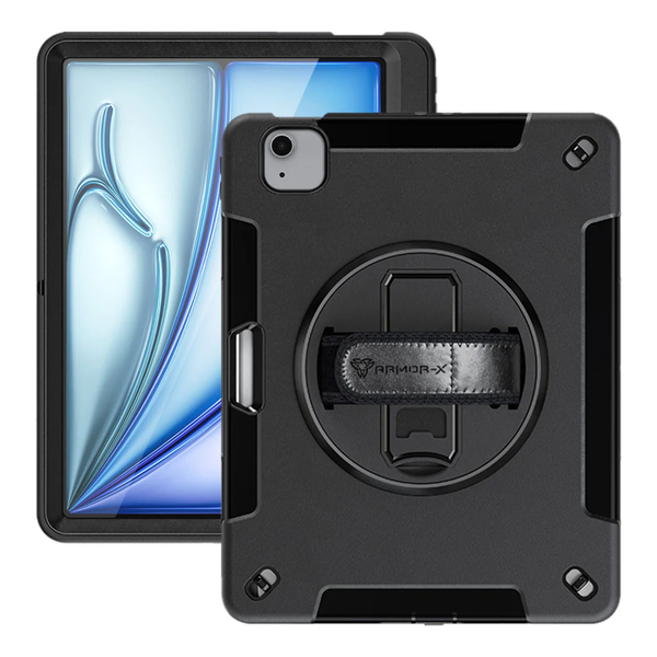 RIN-iPad-A5 | iPad Air 11 ( M2 ) | Rainproof military grade rugged case with hand strap &; kick-stand (built-in screen protector) - Ultra 3 layers impact resistant design - Crystal clear built-in screen protector - Rainproof from the top of the device with the screen facing upward** - Rigid engineering material covers protects against drops - Premium TPU shock absorption cladding provides extreme protections - Military Grade MIL-STD-810G 1.2 meter / 4 feet shockproof protection - Kickstand feature for typing, playing games and watching movies - 360 degree swivel hand strap design for one-handed operation - Super sturdy and Easy To Carry. Absolutely Kids Friendly Design - Front raised edges recess your screen to protect it when placed face down - Form fitting design crafted with high precision - Precise cutouts and tactile buttons ensure quick access and feedback *REMARK: Shoulder strap is included