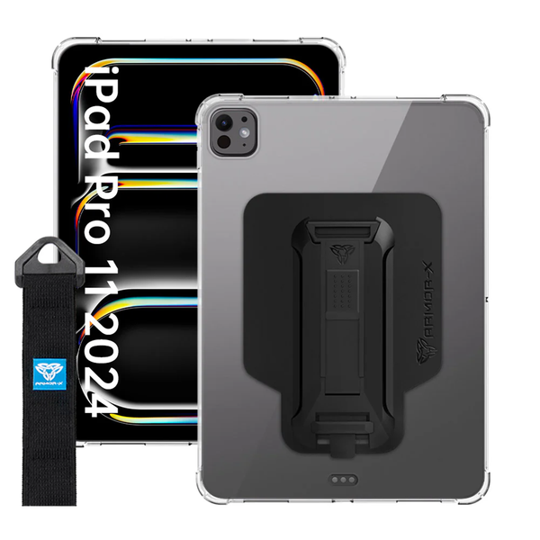 ZXS-iPad-PR11CL | iPad Pro 11 ( M4 ) | 4 corner protection case w/ hand strap kick stand &; X-mount - Excellent protection with TPU shock absorption housing - Unique corner bumpers design provide extra drop protection - Engineering material Polycarbonate PC X-MOUNT adaptor - Built-in kickstand - Hand strap design to free your hands - Cover all the edges and corners to offer full protection all around the device. - Raised edges lift the screen and camera lens off the surface to prevent damaging - Form fitting design crafted with high precision - Precise cutouts and tactile buttons ensure quick access and feedback - Integrated X-MOUNT adaptor with secure mounting solutions - A wide selection of mounts design for outdoor adventures and sports - X-MOUNT interface - TYPE-T *REMARK: Shoulder strap is included.