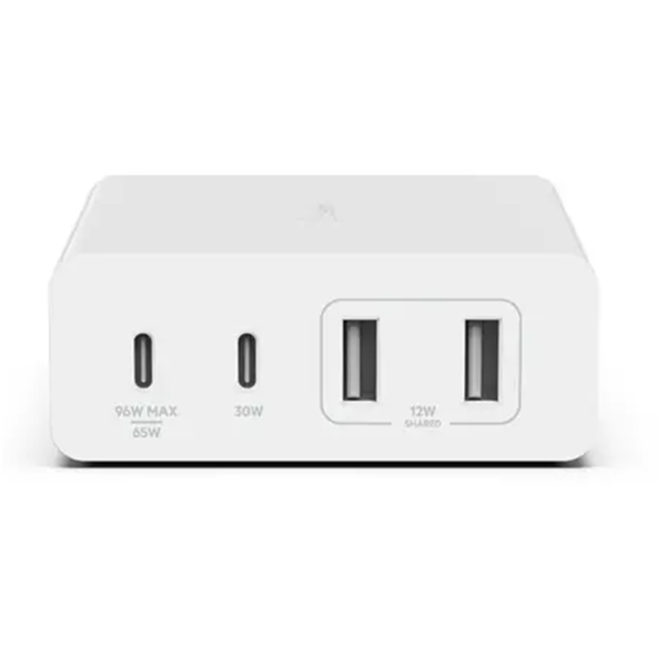 - 4-port GaN charger includes 2x USB-C and 2x USB-A ports - Charge up to 4 devices with 108W of total power output - Integrated GaN technology provides a high-power, efficient charge - USB-C PD 3.0 to charge a MacBook Pro from 0-50% in 39 mins* ?or charge an iPad from 0-50% in 39 mins and iPhone 14 Pro from 0-50% in 26 mins- Intelligent Power Sharing recognizes power needs and distributes proper output to up to 4 devices - Designed to sit on desk and includes a 2m / 6.6-foot power cable - Supports a wide range of devices including laptops, smartphones, tablets, and more from Samsung, Apple, and more Powerful Laptop Charger for Your Desktop Charge a MacBook Pro at full speed or fast charge an iPhone and iPad while charging two additional devices at the same time with our 108W 4-Port GaN Charger. This powerful GaN charger is designed to sit on top of a desk, giving you easy access to its 2x USB-C and 2x USB-A ports. It supports a wide range of devices including MacBook, iPhone, iPad, Apple Watch, Samsung, as well as other USB-C smartphones, tablets, and laptops. Features GaN technology which provides high wattage and increased charging efficiency and Intelligent Power Sharing which distributes the most efficient power to your device.