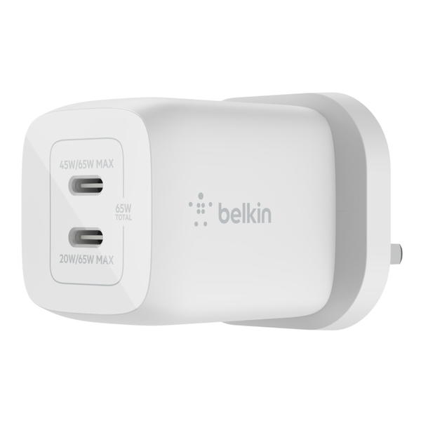 while fast charging an iPhone 13 at the same time with our powerful and ultra-compact 65W dual USB-C wall charger. It's engineered with GaN, USB-C PD 3.0 and PPS charging technologies to deliver a fast and safe charge that won't overheat or overcharge for both Apple and Samsung devices. Access up to 65W of power when using a single port or up to 45W of power from the top port and up to 20W from the bottom port when using both. It easily fits in a pocket or a bag, making it the ideal charger for traveling or when at home. Compact GaN Power Features the latest in GaN technology for a safe, efficient, and ultra-compact high-powered charge that won't overheat or over-charge. Fast Charge iPhone and Samsung USB-C PD 3.0 and PPS charging technologies help deliver a powerful and efficient charge to a wider range of devices. Charge an iPhone 13 from 0-50% in 28 mins and a Samsung S21+ from 0-50% in 27 mins. Double Your Charging Potential Comes with USB-C PD 3.0 with PPS charging technologies to deliver a powerful and fast charge for up to two devices: