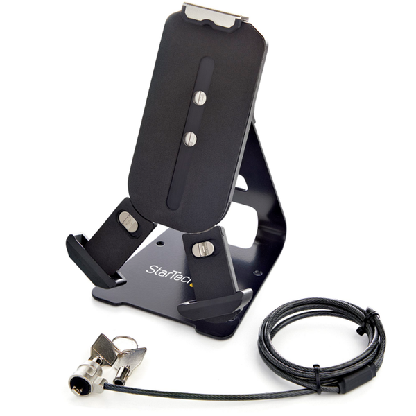 This universal tablet holder enables you to mount and use your tablet as a second display, or as a point of sales terminal while having access to all ports/buttons/cameras. Works with tablets between 7.9" and 13", and it supports tablets up to 0.3" thick and up to 1.5lb / 0.7kg in weight. Its extendable and locking gripping arms holds the tablet in place to avoid it slipping from the stand while you are interacting or typing on it. Range of motion Tilt (180°) and rotate (360°) your tablet to adjust it to the ideal viewing angle depending on your application, whether it is in portrait or landscape mode. The 2 pivot point design helps in providing the same range of motion for small and bigger tablets. Secure your devices The secure tablet display stand offers several ways to protect your devices, especially in cases where you need to leave your equipment unattended. It comes equipped with 2x Kensington slots (k-slots) so you can use with anchor or in multi-lock setups using the Universal Laptop Cable Lock Expansion Loop - BRNCHLOCK (not included). For added security, you can also screw the stand to a desk or countertop using the including screws. Thoughtful design SECTBLTDT has been designed with your devices in mind, foam padding and spacers are built-in into the gripping arms to make sure your device stays in place while protecting it from scratches or scuffs. In addition, it comes with rubber feet pads to protect your desk or mounting surface. - UNIVERSAL TABLET STAND: Secure tablet stand works with a wide range of tablets from 7.9-13 inch &; up to 0.3" (9.5mm) in thickness; Supports 1.5lb (0.68kg); Extendable swiveling arms allow for different aspect ratios &; provide access to all ports/cameras - INCREASED SECURITY AND CABLE LOCK INCLUDED: Locking tablet arms secure tablet in place; For added security, you can screw the base to your desk (screws incl.); Features 2x Kensington style K-slots &; 1x 6ft K-slot keyed laptop lock (2 keys incl) - WIDE RANGE OF MOTION: Adjustable articulating tablet stand offers 180° vertical tilt (if base secured to desk) &; 360° rotation (portrait &; landscape); Two pivot point design allows the stand to offer the same range of motion when using larger tablets - THOUGHTFUL DESIGN: Lockable anti-theft tablet holder features foam padded spacers to fill gaps in the 9.5mm thickness of the grips to protect your devices; Base offers rubber feet to protect desk surfaces; Cable management slots on the back of the mount - COMPATIBILITY: Universal tablet stand supports a range of tablets including iPads (such as 10.2" iPad, 12.9 &; 11" iPad pro, 10.9" iPad Air, 7.9" iPad mini), Samsung Galaxy Tab, Android Tablets; Ideal for POS, kiosk, retail display, business