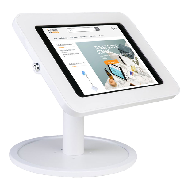 TAB SECURE DESK WITH FREE STANDING BASE Secure your tablet in style with the Tab Secure Tablet stands. This Free Standing solution allows you to mount any tablet on any surface. Help your customers to help themselves when things get busy; put your tablets to work as an engaging tool and let it interact with your clients. - Internal specific tablet fitting kit - Can be mounted in landscape or portrait mode- Tamper proof tubular lock with 2 keys- Kensington lock point for optional extended security- Radio-transparent chassis for Wi-Fi, Bluetooth, 3/4G, and NFC Secure Enclosure Each enclosure is secured together by a high quality key and barrel. Ground Support Built from strong high grade aluminium alloy to support and secure your tablet.