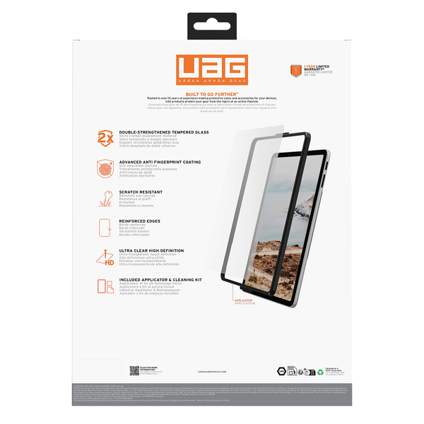 Premium quality, maximum protection. Our Double-Strengthened Tempered Glass screen protector, now able to withstand steel ball drops from 6 ft / 1.8 m. With advanced oleophobic coating for fingerprint resistance, precision touch, and ultra-clear HD visuals. Expertly designed for use with UAG Cases, it's the ultimate in device protection and clarity. Couple our tempered glass screen shields with one of our cases to experience unparalleled protection on all your adventures. - Double-Strengthened Tempered Glass.- High quality / high strength tempered glass.- Advanced oleophobic (anti-fingerprint) coating.- Precision Touch.- Ultra Clear High Definition.- Compatible with Surface Slim Pen.- Applicator and Cleaning Kit included.
