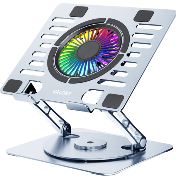Valore HL-001 Adjustable Laptop Stand with Fan The Laptop Stand with Cooling Fan incorporates RGB lighting for a stylish touch, alongside ergonomic elevation and efficient laptop cooling.