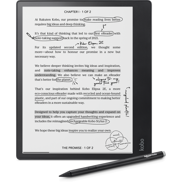 Read up. Write down. Think big. With an upgraded note-taking experience and eco-conscious materials. Made for big thinkers and bundled with Kobo Stylus 2, the newly upgraded Kobo Elipsa 2E is designed to help you focus and organize your thoughts. Write directly on eBooks and PDFs* with Kobo Elipsa 2E's improved note-taking experience. Create and organize notebooks that do more than paper, and export them with integrated cloud services. Read and write comfortably on a 10.3" touchscreen with ComfortLight PRO to reduce blue light and ease eyestrain. Listen to Kobo Audiobooks with Bluetooth® wireless technology**. With 32GB of storage, carry your entire library and all your notes wherever you go. Made with recycled and ocean-bound plastic, the eco-conscious Kobo Elipsa 2E is designed to capture all your big thinking. Handwriting experience powered by MyScript.*PDFs with digital rights management or permission limitations are not compatible with markups or annotations.**Audiobooks available only in select countries. Bluetooth® wireless headphones or speaker required.