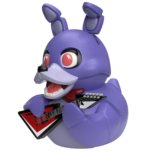 Five Nights at Freddy's: Bonnie TUBBZ Boxed Collect them all - before they collect you! - Designed by Numskull Designs- TUBBZ - iconic characters turned cosplaying ducks- Boxed Edition- Premium PVC, packed with detail- Stands approx. 3.54" (9cm) outside the packaging- A must have for any Five Nights at Freddy's fan! *This toy is not suitable for children under the age of 3 years Purple Rocker Bonnie Joins Tubbz Collection Bonnie's got riffs, rhythm, and now… webbed feet? This iconic purple performer has taken a dive into the TUBBZ pond and surfaced as a quacking collectible! With his red bowtie and guitar slung over his shoulder, Bonnie's ready to rock any collection.