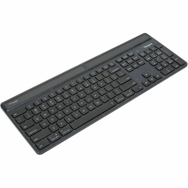 A keyboard for people and the environment. The Targus® Sustainable Energy Harvesting EcoSmart™ Keyboard is GRS certified and combines ultra-efficient Bluetooth® and advanced solar technologies. If you are on the hunt for an eco-friendly keyboard that doesn't sacrifice size, this is it. This wireless keyboard is infused with germ protection*, helping to prevent the growth of pesky microbes like bacteria. It simultaneously helps to protect the environment with construction made from up to 85% post consumer recycled materials. This is one of our most sustainable keyboards - even its packaging is recycled. It is primarily powered by solar cells optimized to harvest light from a variety of light conditions (including indoor lighting). It connects to up to 3 devices using Bluetooth® SoC. This extremely low-power capability makes it considerably more power efficient than other Bluetooth keyboards. It also features Targus DefenseGuard™ Antimicrobial Protection. Unlike topically applied sprays, this DefenseGuard keyboard is infused with additives that don't wear or wash off. They also work for the life of the product. This eco-conscious keyboard was designed to embody sustainable practices in the workspace and beyond, and deliver a comfortable typing experience. It's lightweight, ergonomic, uses ultra-low power consumption, has multiple device ports, and plug-and-play function. Overall, a superior addition to your workspace. Energy Harvesting Solar Capabilities Enjoy power via solar cells (amorphous silicon photovoltaic cells), which are optimized to harvest light from indoor lighting. This sustainable keyboard also connects using Atmosic™ ATM3 series Bluetooth® SoC. Made from Sustainable Material Avoid the harmful impact of production of new materials. This GRS certified sustainable keyboard was designed from the ground up to embody eco consciousness. Its main materials are up to 85% Global Consumer Recycle (GRS)-certified post-consumer recycled plastic. Thanks to this keyboard, you can enjoy full size capability without harming the environment. Power Efficiency The full size keyboard comes equipped with an ultra low-power Bluetooth chipset. Don't waste your charge! Rely on a low power Bluetooth keyboard that is considerably more power efficient than today's full size keyboards. DefenseGuard™ Antimicrobial Keyboard Protection Topically applied sprays can wash off and wear over time. They also require extra work on your end as they need to be regularly reapplied. With an infusion of antimicrobial eco friendly keyboard additives, you can rest assured your keyboard is fully and consistently protected. DefenseGuard™ offers this antimicrobial keyboard protection from microorganisms that lasts for the life of the product. If you are looking for unmatched eco friendly keyboard and wireless keyboard and mouse solutions on the market, trust Targus. Our gaming keyboards, professional keyboards, and computing accessories bring novel features and modern perspectives that our customers need.