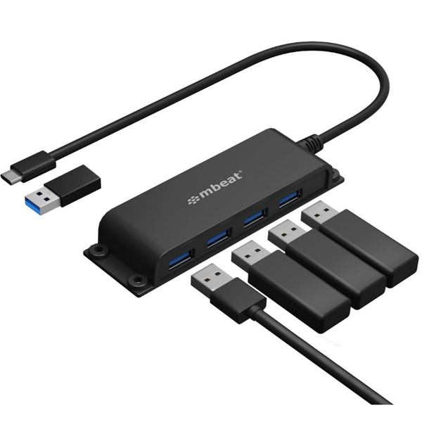 mbeat® Mountable 4-Port USB-A USB-C Adapter Hub - 60cm Data Cable, USB 3.0, 2.0 High-Speed Data Port Expansion, Save Space Mounting Solution - 4-Port USB-C to USB 3.0 high-speed data hub for instant port expansion.- USB-A to USB-C male-to-female adapter included for universal connectivity.- 60cm extra-long data cable to accommodate any configuration.- Space-saving mounting solutions for handy access to additional ports.
