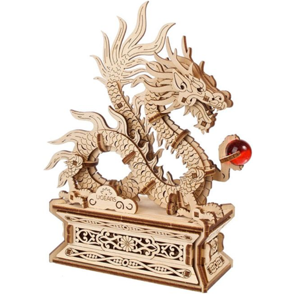 hongbao) inside the drawer, enclosing a Lunar New Year's gift, then present the Wood Dragon with both hands and challenge the recipient to open the treasure box! The Wood Dragon from Ugears is a very special model for 2024-the year of the Wood Dragon. Like all Ugears models it's made of art-quality composite wood. You won't need glue or special tools to build this lucky model-just push the pieces out of their precision laser-cut boards and snap them together following the step-by-step, full-color illustrated instructions in 11 languages. The model kit includes a metal spring that powers the drawer mechanism, a transparent red glass orb, and a piece of sandpaper and wax to smooth and lubricate the moving parts for optimal function.It joins the European-style Windstorm Dragon in Ugears' dragon collection. Collect both to compare how this mythical beast is depicted in each culture.Give the Ugears Wood Dragon as a very special gift for Chinese New Year 2024, either as a boxed set for your recipient to build, or build the model yourself and present the elegant Wood Dragon as a completed model, perhaps with a hongbao inside the secret drawer, for an extra special New Year's gift!