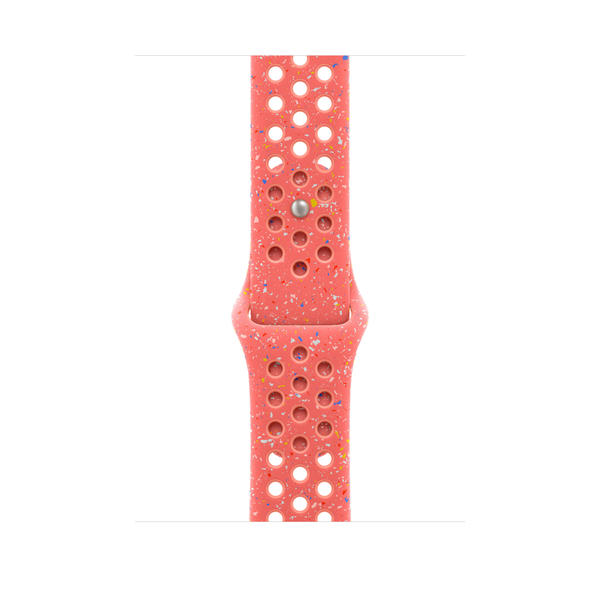 45-mm Magic Ember Nike Sport Band - S/M Made with compression-moulded perforations for breathability, the Nike Sport Band is durable and strong, yet surprisingly soft. It features colourful flakes that create a randomised pattern, making each band completely unique. The smooth, dense material drapes elegantly across your wrist and feels comfortable next to your skin. A new aluminium pin-and-tuck closure gives the pin a fresh matt finish. This band contains at least 32 per cent recycled fluoroelastomer, with each flake containing at least 66 per cent recycled fluoroelastomer.
