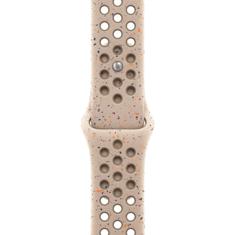 Made with compression-moulded perforations for breathability, the Nike Sport Band is durable and strong, yet surprisingly soft. It features colourful flakes that create a randomised pattern, making each band completely unique. The smooth, dense material drapes elegantly across your wrist and feels comfortable next to your skin. A new aluminium pin-and-tuck closure gives the pin a fresh matt finish.