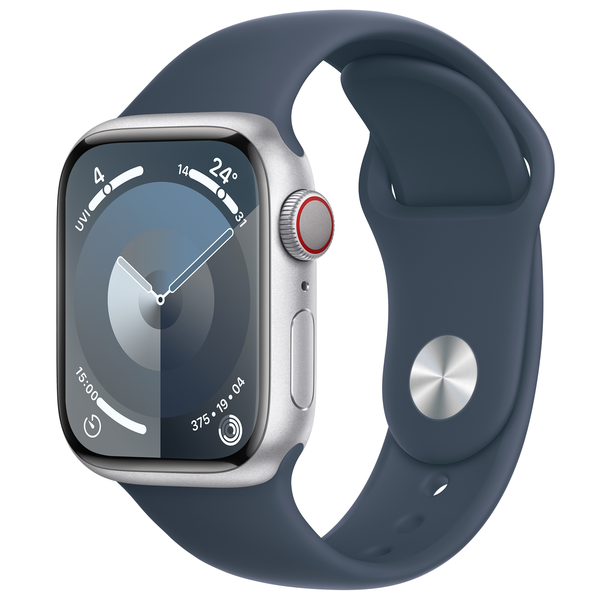 Apple Watch Series 9 (GPS + Cellular) 41mm - Silver Stainless Steel Case with Storm Blue Sport Band - S/M (Fits 140mm to 190mm Wrists)