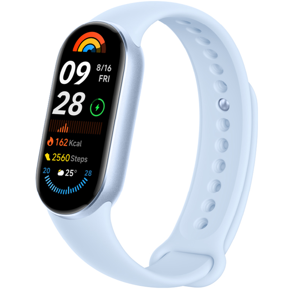 Notes: *This product is not designed as a medical device or intended to diagnose, treat, cure or prevent any disease. All data and measured values are for personal reference only.*The product images and models, data, functions, performance, specification parameters, user interface and other product information on this page are for reference only and may differ from the actual product. Xiaomi may amend this information. For details, please refer to the actual product.*The content and features shown on this page cannot be guaranteed to remain permanent and may be amended due to changes in copyright, commercial or technical conditions. In case of any amendments without individual notification, please refer to the actual contents and features of the product.*Strap accessories shown on this page need to be purchased separately.*Test data comes from Xiaomi Internal Labs. The 10.95mm thickness does not include the PPG protrusion. 15.8g refers to the device weight without the strap.*Product effects in the illustrations are for reference only. Actual experiences may vary. Irregular metal straps cannot be laid flat. Please avoid forcibly pressing them flat to prevent damage.*Water-resistant to 50 m: Based on the GB/T 30106:2013 test standard, the Xiaomi Smart Band 9 has been certified water-resistant by TUV SUD. Water resistance rating report number: 68.189.24.0135.01. Rated 5ATM water-resistant (equivalent to a submersed depth of 50 metres). This means it can be worn in swimming pools, while swimming near the shore and during other shallow water activities. It is not suitable for wearing in hot showers, saunas, or while diving. Make sure to avoid direct impacts from swift currents. Water resistance is not permanent and may reduce over time.*Typical usage mode test conditions for the Xiaomi Smart Band 9: With the battery fully charged, using factory default settings, with a static watch face and with high-precision sleep monitoring, in-sleep breathing monitoring, and all-day stress and blood oxygen monitoring turned off; whole-day heart rate monitoring turned on at a frequency of once every 30 minutes; message reminders (100 messages, 10 call reminders, 3 alarms per day) turned on; screen arm-movement activated 200 times per day; blood oxygen saturation manually measured twice per day and movement recording turned on for 60 minutes per week.*AOD mode test conditions for the Xiaomi Smart Band 9: With the battery fully charged, using factory default settings, with a static watch face, AOD display turned on, and with high-precision sleep monitoring, in-sleep breathing monitoring, and all-day stress and blood oxygen monitoring turned off; whole-day heart rate monitoring turned on at a frequency of once every 30 minutes; message reminders (100 messages, 10 call reminders, 3 alarms per day) turned on; screen arm-movement activated 200 times per day; blood oxygen saturation manually measured twice per day and movement recording turned on for 60 minutes per week.*Heavy-load mode test conditions for the Xiaomi Smart Band 9: With the battery fully charged, using factory default settings, with a static watch face, AOD display turned on, and with high-precision sleep monitoring, in-sleep breathing monitoring, all-day stress and blood oxygen monitoring, and whole-day heart rate monitoring once per minute turned on; with message reminders (100 messages, 10 call reminders, 3 alarms per day) turned on and movement recording turned on for 60 minutes per week.*All battery life testing data comes from Xiaomi Internal Labs. Battery life during actual use may vary due to factors such as setup, operation and environment and may differ from laboratory results.*Some device functions (including but not limited to call reminders, notification reminders and so on) require the app to run in the background. For specific instructions, please refer to the prompts on the band or in the app.*Do not expose the Smart Band to strong magnetic fields as the functionality of the device may be affected.