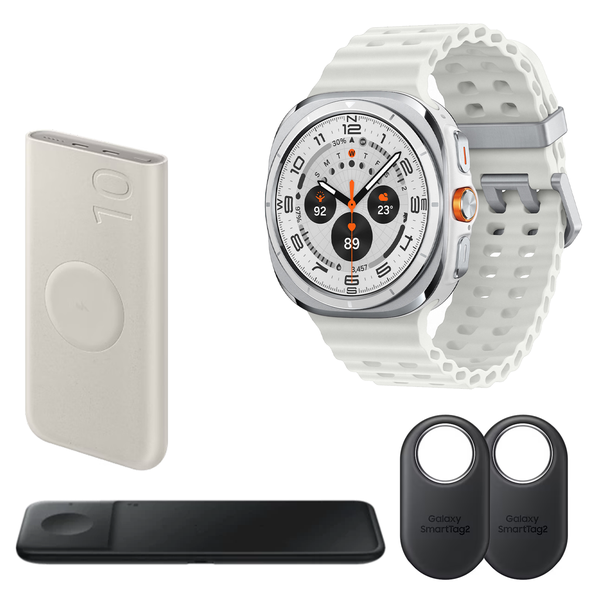 Samsung Galaxy Watch Ultra (2025) - Titanium White with Gray Marine Loop Bonus Samsung 3-in-1 Wireless Charger, 10,000mAh Wireless Power Bank (RRP $238) & Galaxy SmartTag2 (2-Pack) (RRP $336)