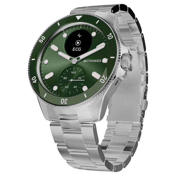 ScanWatch Nova is a 10 ATM watch with iconic diver style that features a unique sunray dial with Super-LumiNova indexes and hands, stainless steel casing with mirror-polished edges, and protective and anti-reflective sapphire glass. It includes a rotating ceramic and stainless steel bezel and an Oyster metal bracelet that tapers from 20 mm to 18 mm for a secure, comfortable fit.
