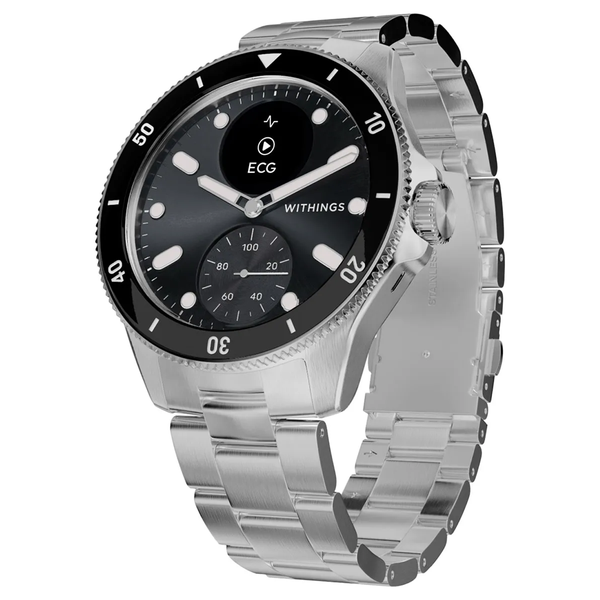 ScanWatch Nova is a 10 ATM watch with iconic diver style that features a unique sunray dial with Super-LumiNova indexes and hands, stainless steel casing with mirror-polished edges, and protective and anti-reflective sapphire glass. It includes a rotating ceramic and stainless steel bezel and an Oyster metal bracelet that tapers from 20 mm to 18 mm for a secure, comfortable fit.