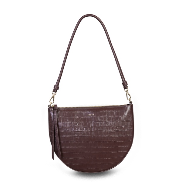 Gani's softly curved shape showcases the textured croc finish beautifully, moving seamlessly from day to evening. The detachable rolled shoulder handle offers versatile styling, while the gold box chain zip pull adds a refined edge.